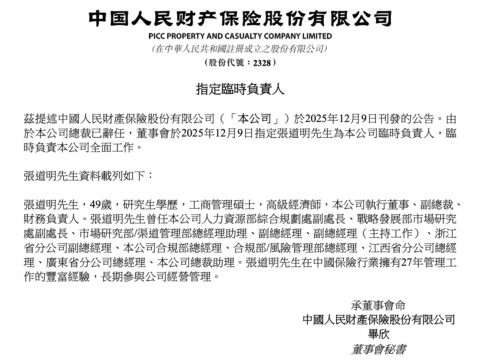 12月9日,中国人民财产保险股份有限公司(简称“人保财险”(02328.HK))公告称,由于公司总裁已辞任,董事会于2025年12月9日指定张道明为公司临时负责人。