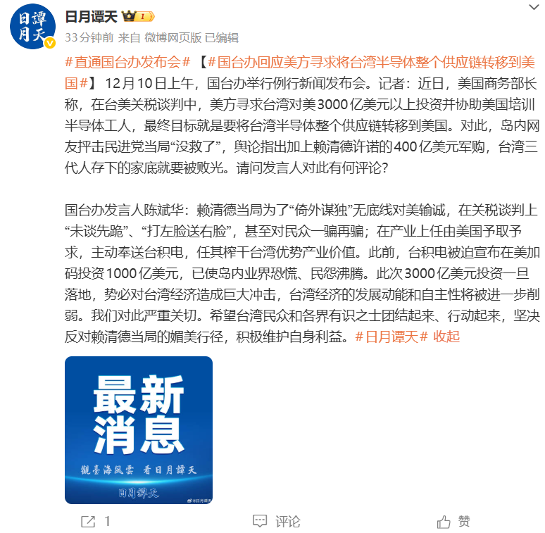 记者:近日,美国商务部长称,在台美关税谈判中,美方寻求台湾对美3000亿美元以上投资并协助美国培训半导体工人,最终目标就是要将台湾半导体整个供应链转移到美国。对此,岛内网友抨击民进党当局“没救了”,舆论指出加上赖清德许诺的400亿美元军购,台湾三代人存下的家底就要被败光。请问发言人对此有何评论?