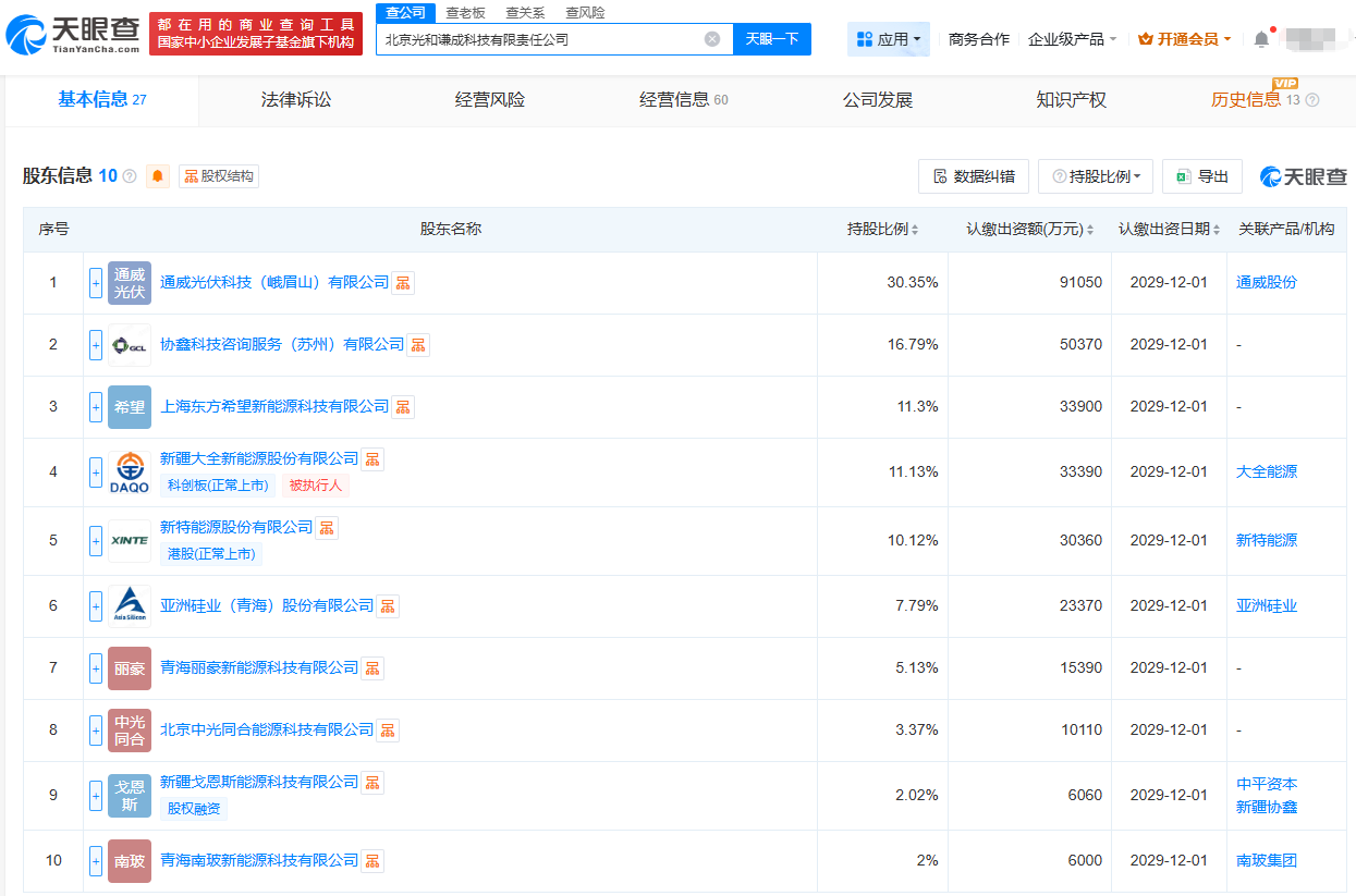 股东还包括南玻新能源(南玻A(000012.SZ)全资孙公司)、青海丽豪、新疆戈恩斯、北京中光同合能源科技有限公司(中国光伏行业协会全资控股),共计10家企业,其中9家为硅料生产企业。
