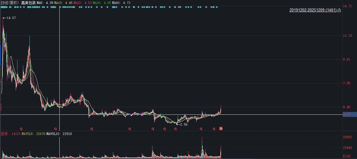 据同花顺iFinD数据,嘉美包装发行价为3.67元/股,2024年9月,嘉美包装曾触及区间低点2.56元/股,这前后,嘉美包装的股价均在发行价上下震荡。