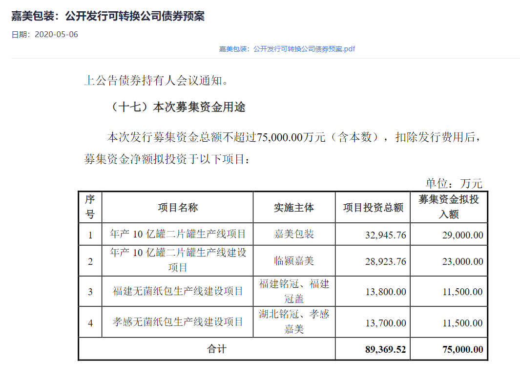 另外,除了首发募资近3.5亿元外,嘉美包装还在2021年发行可转债,募集资金总额7.5亿元。然而,彼时4个募投项目中有3个已发生变更,其中原本投向“年产10亿罐二片罐生产线项目(嘉美包装)”项目的2.56亿元用于永久补充流动资金。