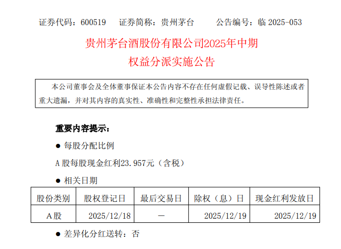 12月10日晚间,贵州茅台(600519.SH)发布2025年中期权益分派实施公告,拟A 股每股现金红利23.957元(含税)。本次利润分配以方案实施前的公司总股本1,252,270,215股为基数,共计派发现金红利30,000,637,540.76元(含税)。股权登记日为2025年12月18日,除权除息日为2025年12月19日,现金红利发放日为2025年12月19日。