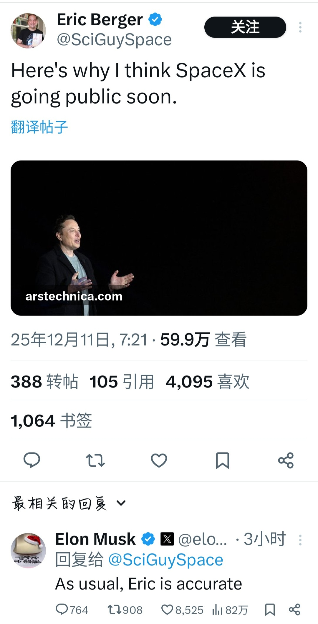 Ars Technica高级太空编辑Eric Berger在一条帖子中写道:“这就是我认为SpaceX很快就要上市的原因。”这篇帖子链接了他在Ars Technica上发表的关于SpaceX上市计划的文章。马斯克回复这则内容称,“和往常一样,Eric是准确的”。