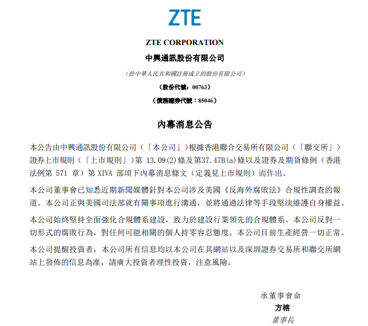 对此,中兴通讯12月11日午间发布公告称,公司董事会已知悉近期新闻媒体针对本公司涉及美国《反海外腐败法》合规性调查的报道。本公司正与美国司法部就有关事项进行沟通,并将通过法律等手段坚决维护自身权益。公司始终坚持全面强化合规体系建设,致力于建设行业领先的合规体系。本公司反对一切形式的腐败行为,对任何可能相关的个人持零容忍态度。本公司目前生产经营一切正常。公司提醒投资者,本公司所有信息均以本公司在其网站以及深圳证券交易所和联交所网站上发布的信息为准,请广大投资者理性投资,注意风险。