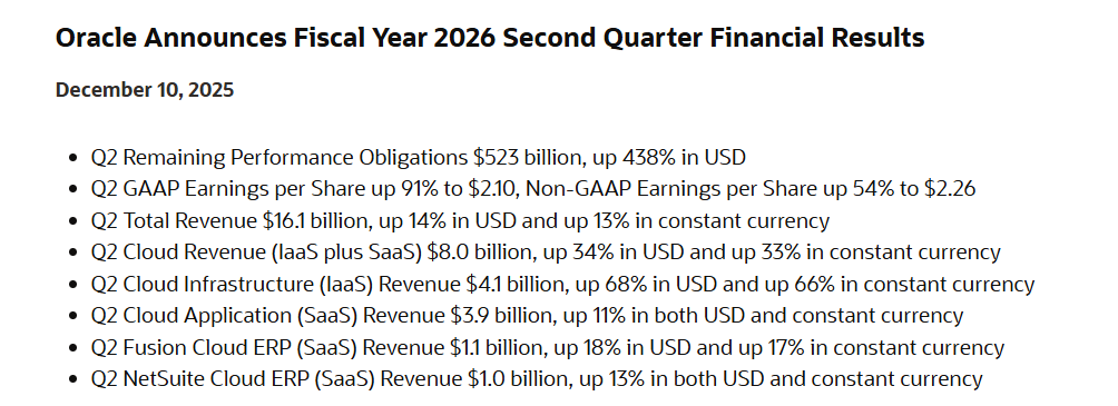 当地时间12月10日,甲骨文盘后公布2026财年第二财季业绩显示,公司营收同比增长13%、云基础设施(OCI)狂飙66%。尽管业绩长亮眼,但公司营收、云业务均不及分析师预期,季度自由现金流(FCF)为-100亿美元。与此同时,公司预计2026财年资本支出将比此前预测高出150亿美元,原因是其云数据库业务为适应人工智能(AI)工作负载而加大投资。