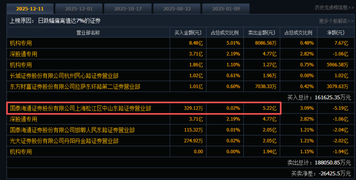 12月11日,中兴通讯(000063.SZ)跌停,盘后龙虎榜数据显示,今日买入榜上,买一和买三均为机构,上榜金额合计超10.34亿元,买方席位合计上榜16.09亿元。卖一席位为活跃游资“中山东路”的国泰海通证券股份有限公司上海松江区中山东路证券营业部,今日卖出5.22亿元。