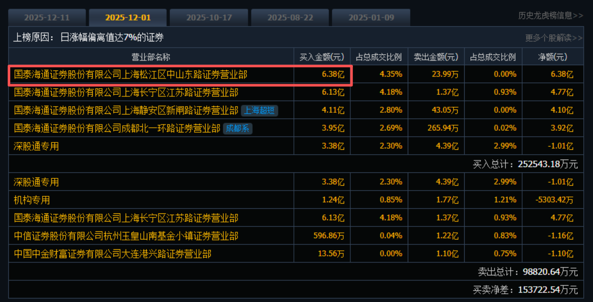 值得一提的是,中山东路正是12月1日将中兴通讯涨停板的主要买方力量之一。根据12月1日龙虎榜,该席位买入6.38亿元,为当天买一席位。