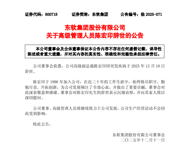 12月11日晚间,东软集团(600718.SH)发布公告称,公司高级副总裁陈宏印因突发疾病于2025年12月10日辞世。