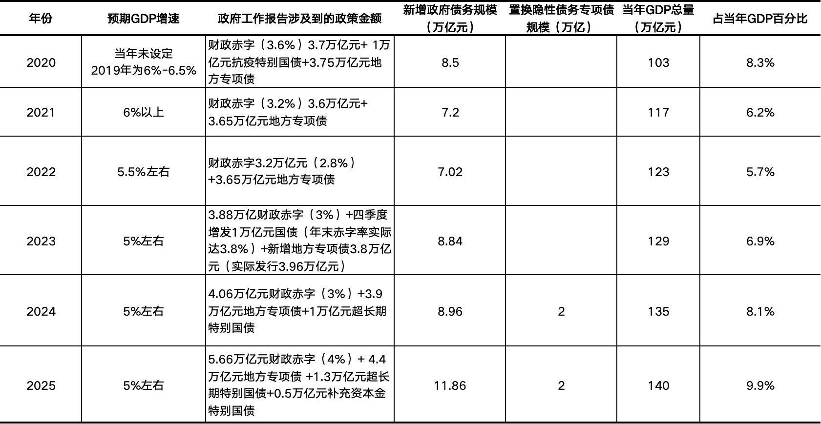 本次中央经济工作会议延续了“实施更加积极的财政政策”的提法。但是与去年会议“加大财政支出强度”的表述不同,本次会议的表述为“保持必要的财政赤字、债务总规模和支出总量”,在表述口吻上相对弱化,也与经济工作目标的口吻一致。2025年两会提出的新增政府债务规模总计为13.86万亿元,占当年GDP的比例约为9.8%。