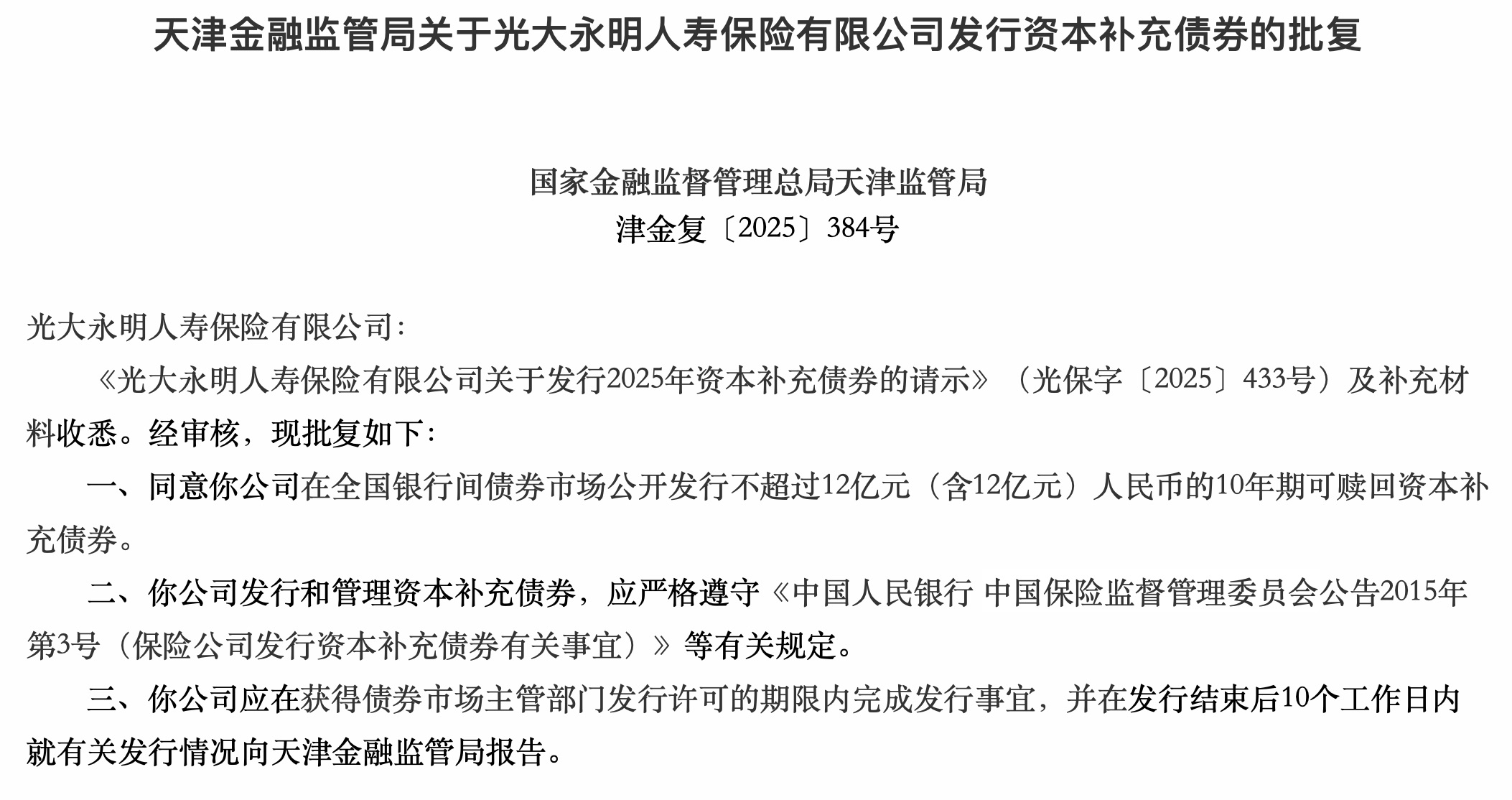 12月12日,天津金融监管局发布的行政许可信息显示,同意光大永明人寿保险有限公司(简称“光大永明人寿”)在全国银行间债券市场公开发行不超过12亿元(含12亿元)人民币的10年期可赎回资本补充债券。