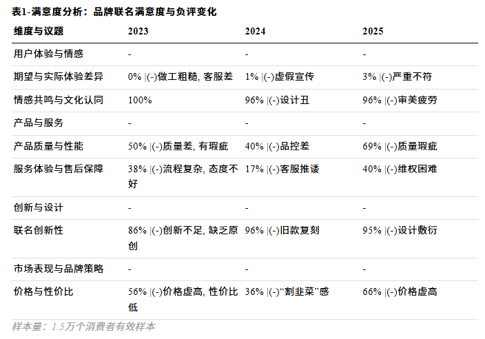 根据久谦中台用户研究工具统计,在1.5万个消费者样本中,2025年,针对品牌联名所涉及的“情感共鸣与文化认同”这一议题,消费者的主要负面反馈集中于“审美疲劳”。