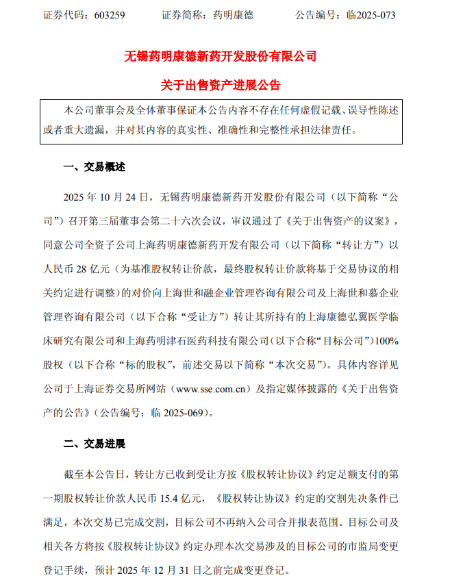 12月15日,药明康德(603259.SH)公告称,公司全资子公司上海药明康德新药开发有限公司已收到受让方支付的首期股权转让价款15.4亿元,《股权转让协议》约定的交割先决条件已满足,本次交易已完成交割,目标公司不再纳入公司合并报表范围。预计本次交易将产生税后净利润约9.6亿元,占公司最近一期(2024年度)经审计归母净利润的比例超过10%。目标公司及相关各方将按协议约定办理市监局变更登记手续,预计2025年12月31日之前完成变更登记。