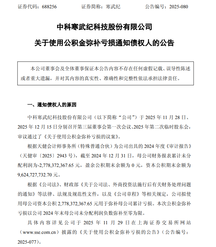 寒武纪拟使用27.78亿元资本公积金弥补亏损 今年前三季度扭亏为盈
