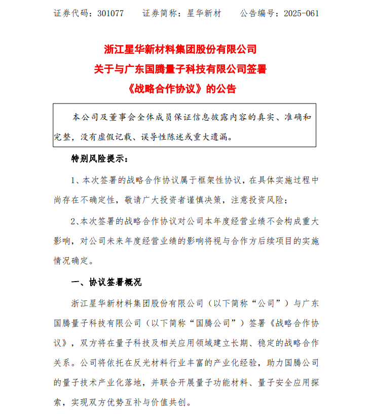 12月15日,星华新材(301077.SZ)公告称,公司与广东国腾量子科技有限公司(简称“国腾公司”)签署《战略合作协议》,双方将在量子科技及相关应用领域建立长期、稳定的战略合作关系。公司将依托在反光材料行业丰富的产业化经验,助力国腾公司的量子技术产业化落地,并联合开展量子功能材料、量子安全应用探索,实现双方优势互补与价值共创。国腾公司是拥有量子通信网络全产业链自主知识产权的前沿科技企业。