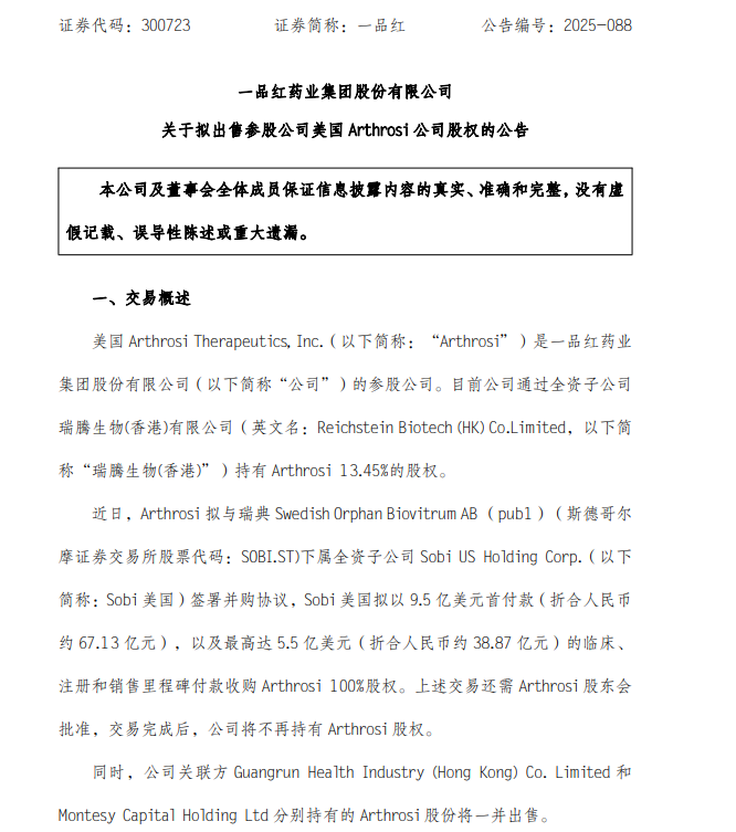 12月15日,一品红(300723.SZ)公告称,公司拟通过全资子公司出售参股公司美国Arthrosi Therapeutics, Inc. 13.45%的股权,交易对方为瑞典Swedish Orphan Biovitrum AB下属全资子公司Sobi US Holding Corp.。交易总价最高或达15亿美元,包括9.5亿美元首付款和最高5.5亿美元的里程碑付款。交易完成后,公司将不再持有Arthrosi股权。本次交易尚需提请公司股东会审议批准。预计本次出让股权将对公司产生积极影响,最终对公司利润的影响金额以会计师审计确认后的数据为准。
