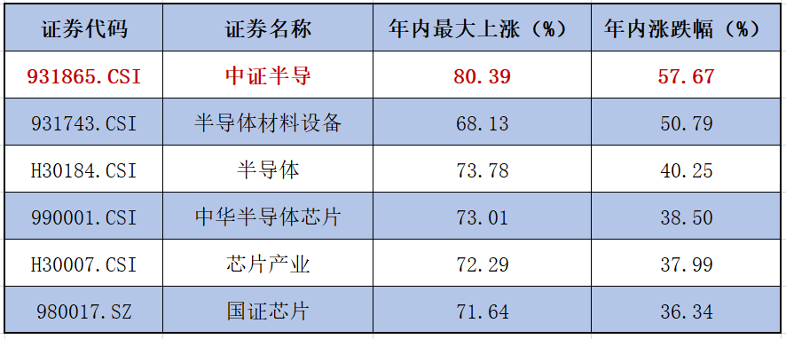 数据显示,中证半导截至12月15日年内涨幅超过57%、区间最大上涨超80%,在芯片产业、国证芯片等同类半导体指数中弹性居于首位。