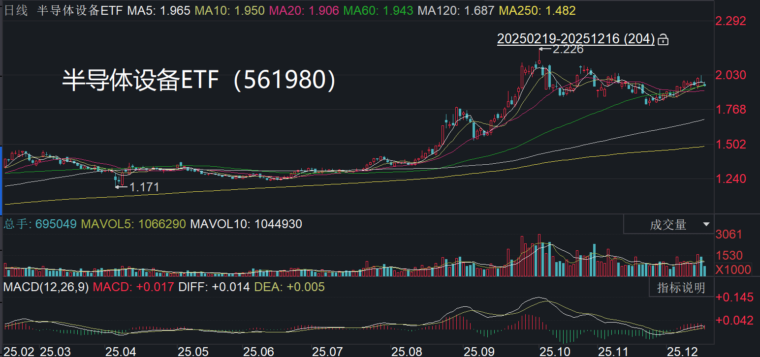 热门国产替代品种半导体设备ETF(561980)临近午盘跌超1%,成分股中微公司(688012.SH)、北方华创(002371.SZ)、中芯国际(688981.SH)、海光信息(688041.SH)多股调整,寒武纪-U(688256.SH)跌超4%。但部分设备厂商和材料企业逆势走强,中科飞测(688361.SH)一度涨近5%,芯源微(688037.SH)涨超4%,中船特气(688146.SH)涨超2%,南大光电(300346.SZ)、华海清科(688120.SH)等多股走强。