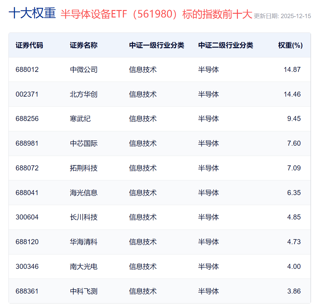 中证指数官网数据显示,半导体设备ETF(561980)跟踪中证半导,标的指数聚焦设备、材料、设计等上游国产替代关键环节,三大行业占比超九成,其中半导体设备含量近六成,覆盖中微公司、北方华创、寒武纪、中芯国际、海光信息等多家龙头公司,或可作为集中布局设备领域的理想工具。