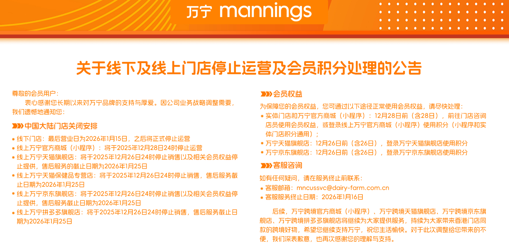 万宁线下门店最后营业日为2026年1月15日,之后将正式停止运营。线上万宁官方商城(小程序)将于2025年12月28日24时停止运营。