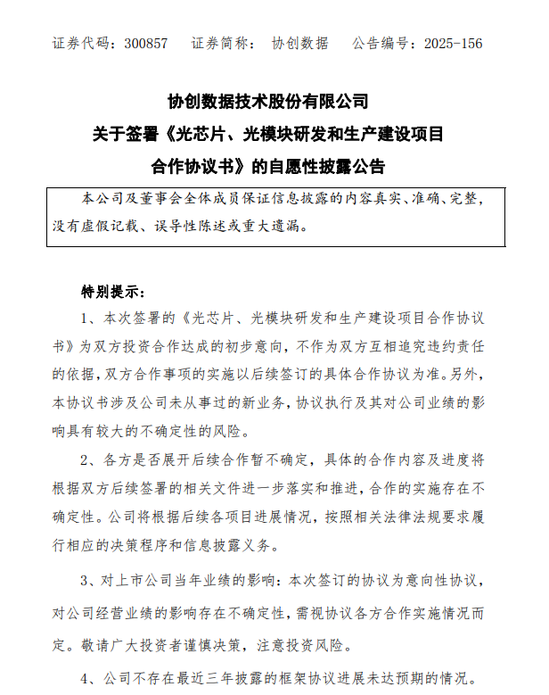 12月17日,协创数据(300857.SZ)公告称,公司近日与广州开发区管委会签署了《光芯片、光模块研发和生产建设项目合作协议书》。公司将在广州开发区,投资光芯片、光模块研发和生产建设项目,主要从事利用自主芯片研发超低功耗光模块,适配AI算力中心、超算中心等高端场景业务。本协议书的签署整体上对公司进入光芯片及光模块行业有着积极的影响,如此次合作事项签订正式协议并顺利实施后,预计将对公司未来的经营业绩产生积极影响。