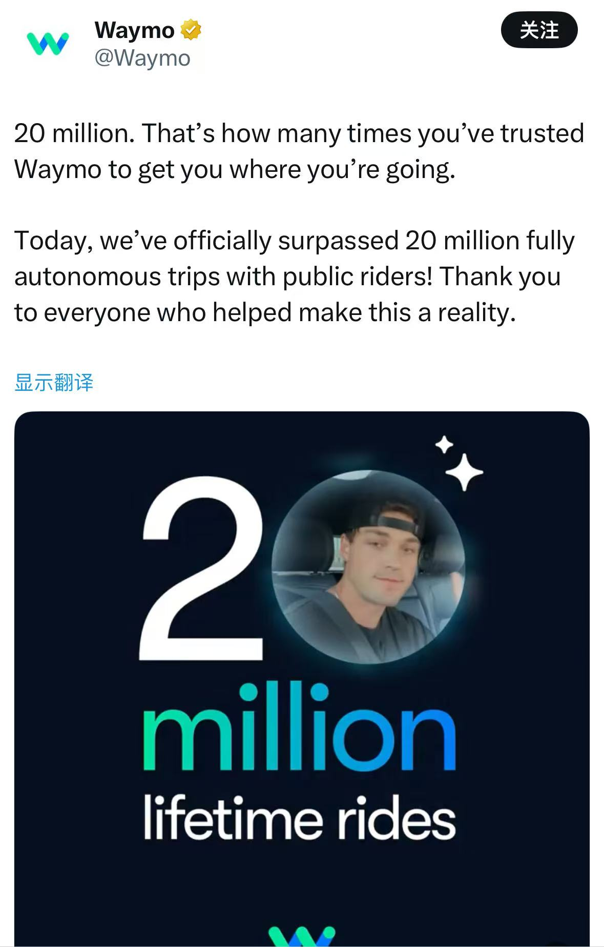 今年5月,Waymo刚刚达到1000万次乘客出行,较此前的500万次仅用时5个月实现翻倍。而这次从1000万次增长到2000万次则仅用了7个月。