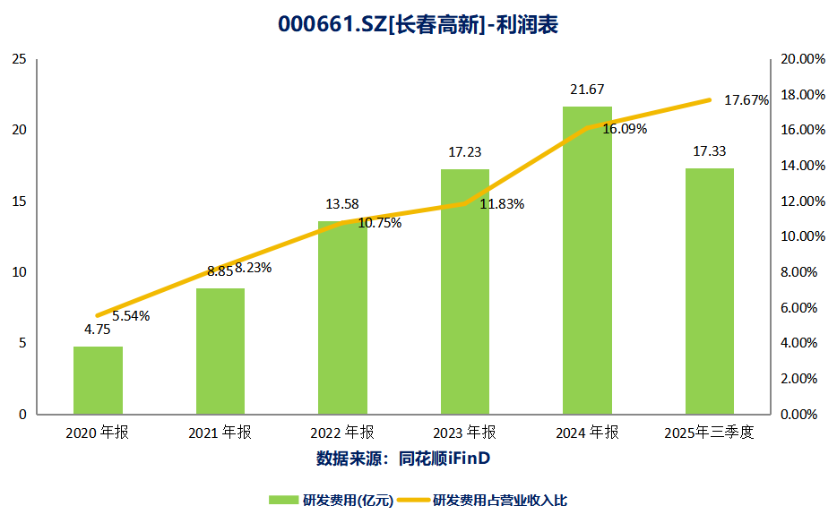 高强度研发投入筑底。长春高新坚持将研发作为战略优先事项,2025年前三季度,研发费用达17.33亿元,同比增长22.91%,研发强度升至17.67%;2021年至2025年三季度年累计研发投入近80亿元,为技术创新和管线布局提供坚实资金支撑。