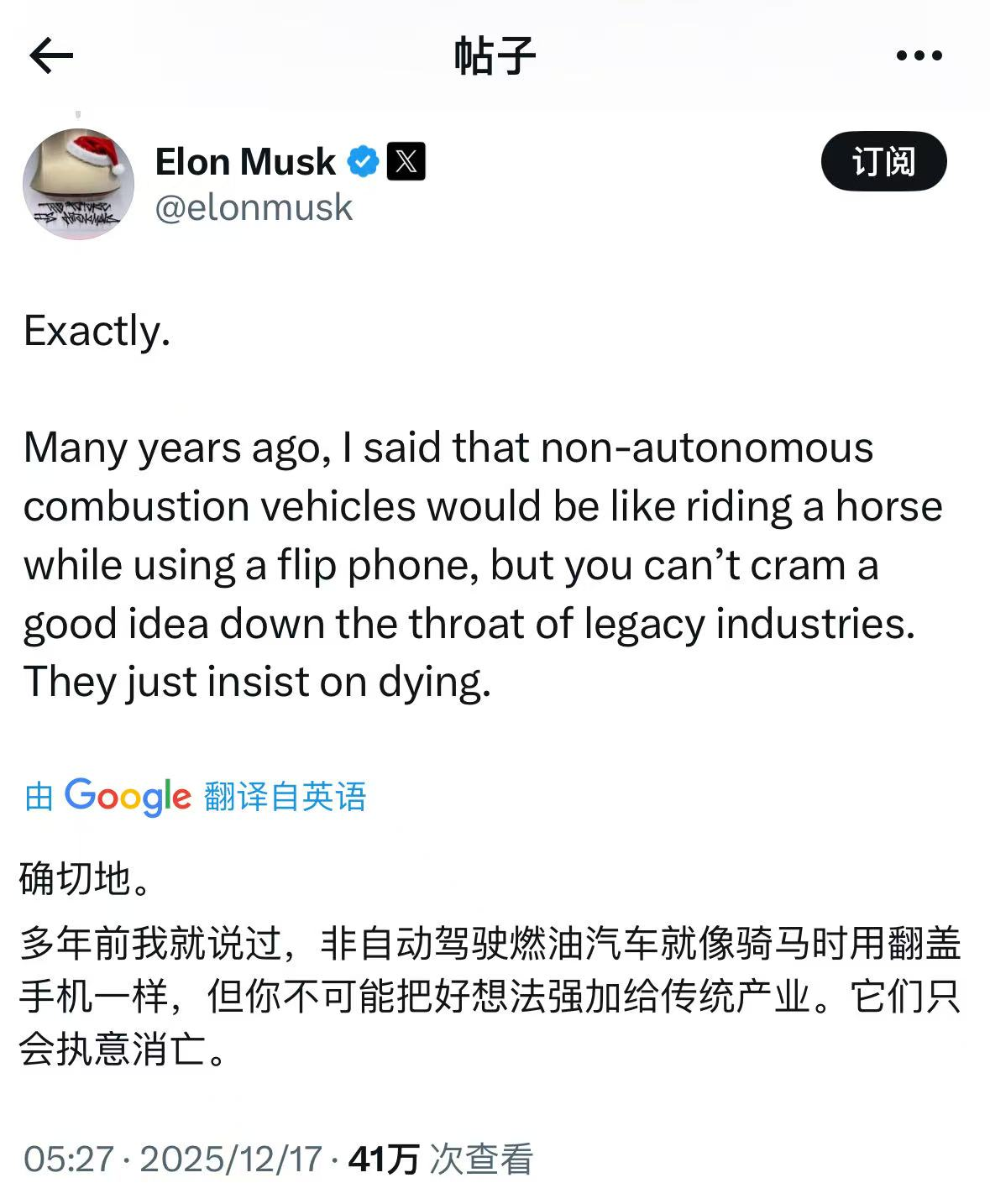 日前,马斯克在社交媒体上称,驾驶非自动驾驶的燃油车,就像“骑马时使用翻盖手机”一样过时。他认为传统燃油车只会逐渐消亡,最终汽车的竞争力将来源于智能化。分析认为,这一表态与马斯克本人的长期观点一致,他近期重申这一点可能与传统汽车行业战略回调有关。