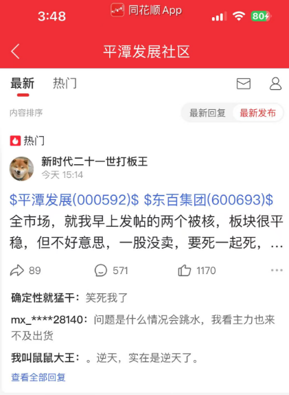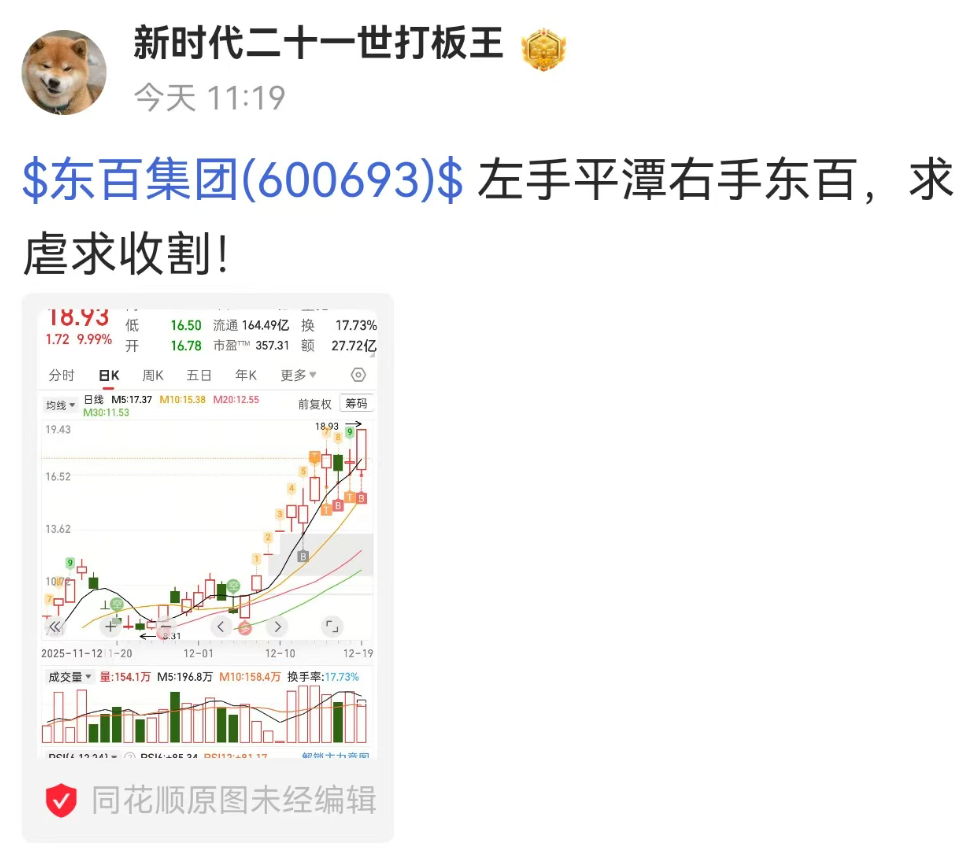 值得玩味的是,同花顺社区有认证投资者“新时代二十一世打板王”在11时19分晒图,并配文“左手平潭右手东百,求虐求收割!”,收盘可谓是“求锤得锤”了,收盘后该投资者发文称其“一股没卖”。