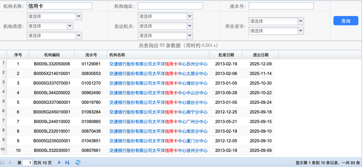 据国家金融监管总局官网信息,年内至少63家信用卡分中心退出,其中交通银行的退出数量较为明显。