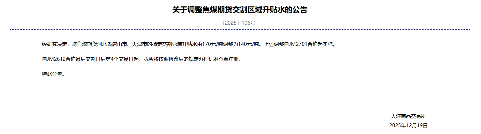 12月19日,大商所公告,经研究决定,将焦煤期货河北省唐山市、天津市的指定交割仓库升贴水由170元/吨调整为140元/吨。上述调整自JM2701合约起实施。自JM2612合约最后交割日后第4个交易日起,我所将按照修改后的规定办理标准仓单注册。