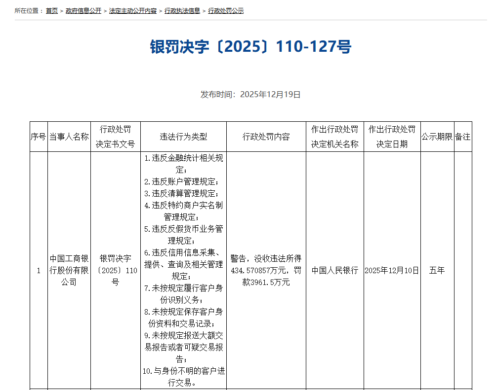 同日,央行行政处罚公示(银罚决字〔2025〕110-127号)显示,工商银行(601398.SH)因10项违法行为,被中国人民银行警告,没收违法所得434.570857万元,罚款3961.5万元。该行的具体违法行为类型如下:1.违反金融统计相关规定;2.违反账户管理规定;3.违反清算管理规定;4.违反特约商户实名制管理规定;5.违反反假货币业务管理规定;6.违反信用信息采集、提供、查询及相关管理规定;7.未按规定履行客户身份识别义务;8.未按规定保存客户身份资料和交易记录;9.未按规定报送大额交易报告或者可疑交易报告;10.与身份不明的客户进行交易。处罚公示期五年。