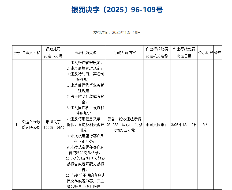 12月19日,央行行政处罚公示(银罚决字〔2025〕96-109号)显示,交通银行(601328.SH)被处以警告,没收违法所得23.98万元,罚款6783.43万元。违法行为类型:1.违反账户管理规定;2.违反清算管理规定;3.违反特约商户实名制管理规定;4.违反反假货币业务管理规定;5.占压财政存款或者资金;6.违反国库科目设置和使用规定;7.违反信用信息采集、提供、查询及相关管理规定;8.未按规定履行客户身份识别义务;9.未按规定保存客户身份资料和交易记录;10.未按规定报送大额交易报告或者可疑交易报告;11.与身份不明的客户进行交易或者为客户开立匿名账户、假名账户。作出行政处罚决定日期为2025年12月10日。该处罚公示期五年。