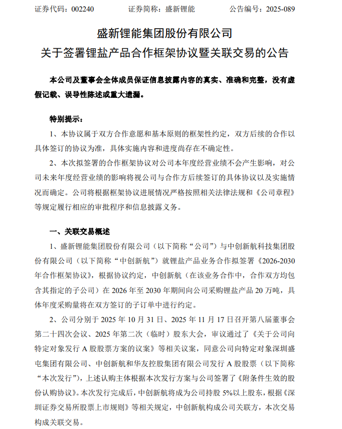 12月19日,盛新锂能(002240.SZ)公告称,公司与中创新航就锂盐产品业务合作拟签署《2026-2030年合作框架协议》,中创新航(03931.HK)在2026年至2030年期间向公司采购锂盐产品20万吨。本次交易构成关联交易,对公司本年度经营业绩不会产生影响,预计将会对公司未来的经营业绩产生积极影响。