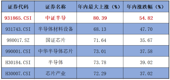 从重仓股来看,中证半导重点布局中微公司、北方华创、寒武纪、中芯国际、海光信息等产业龙头,前十大集中度近8成。截至12月19日,该指数2025年年内涨幅54.82%,区间最大上涨超80%,在中证全指半导体、中华半导体芯片、国证芯片等主流半导体指数中位列第一。