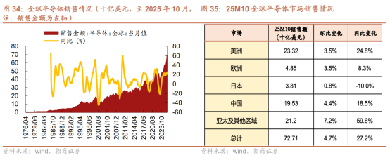 招商证券指出,本轮半导体周期从23M2开始环比持续复苏,主要系AI需求持续旺盛拉动,25M10全球半导体销售额727亿美元,同比+27%/环比+5%;预计2025年全球半导体销售额7722亿美元,同比+22.5%,同时上修2026年全球销售额至9754亿美元,同比+26.3%。未来随着国内大厂资本开支增长,中国半导体销售额有望持续增长