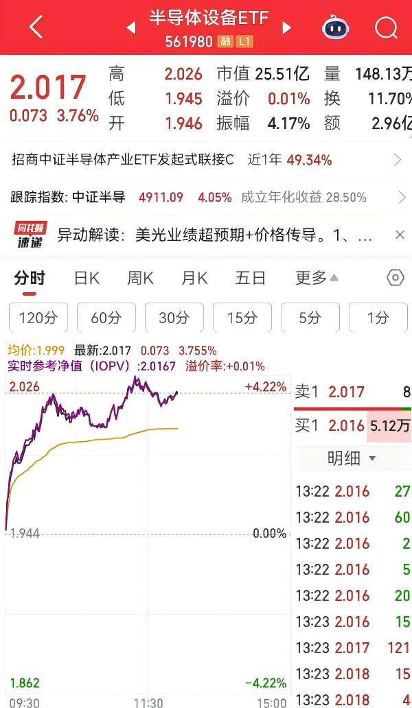存储芯片持续活跃,本周一再度高开拉升,珂玛科技(301611.SZ)开盘涨停。上游半导体设备需求受益,表现强势。半导体设备ETF(561980)盘中一度飙涨超4%,目前涨3.76%,午后成交额高达2.96亿元。