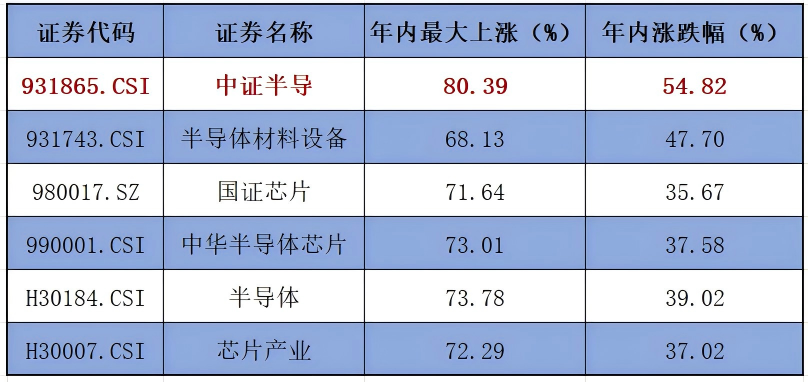 从重仓股来看,中证半导重点布局中微公司、北方华创、寒武纪、中芯国际、海光信息等产业龙头,前十大集中度近八成。截至12月19日,该指数2025年年内涨幅54.82%,区间最大上涨超80%,在中证全指半导体、中华半导体芯片、国证芯片等主流半导体指数中位列第一。