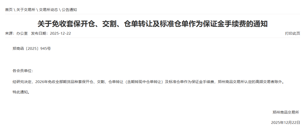 12月22日,郑商所通知,经研究决定,2026年免收全部期货品种套保开仓、交割、仓单转让(含期转现中仓单转让)及标准仓单作为保证金手续费,郑州商品交易所认定的高频交易者除外。