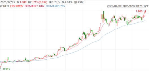 12月23日,贵金属、工业金属齐涨,山东黄金涨超6%,中钨高新、厦门钨业、云南锗业、中矿资源、中金黄金等跟涨。矿业ETF(159690)涨1.71%,实时价格1.906元刷新上市以来新高。
