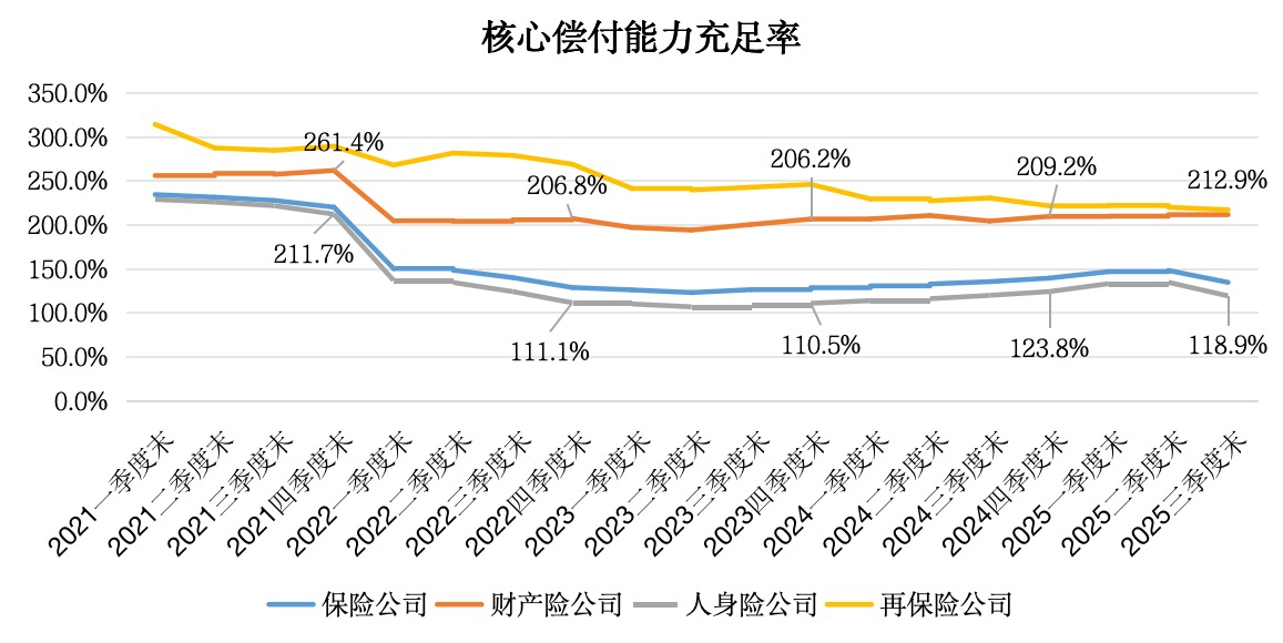 自2022年“偿二代”二期规则实施后,保险公司偿付能力充足率普遍下行。2022年一季度,保险公司核心偿付能力充足率及综合偿付能力充足率两项关键指标均出现大幅下降,财产险公司、人身险公司的核心偿付能力指标分别下降57.2pct、75.1pct;另外,财产险公司的综合偿付能力指标下降47.4pct。据国家金融监管总局发布的最新数据,2025年三季度末,财产险公司、人身险公司综合偿付能力充足率分别为240.8%、175.5%;核心偿付能力充足率分别为212.9%、118.9%。
