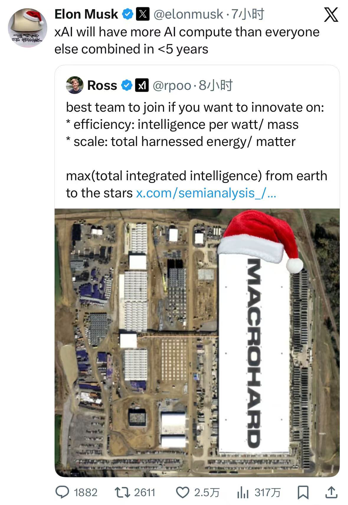 12月25日,特斯拉(TSLA.US)CEO及XAI创始人马斯克在社交平台X上发文表示,未来5年内,XAI 的人工智能计算能力将超过其他所有机构的总和。