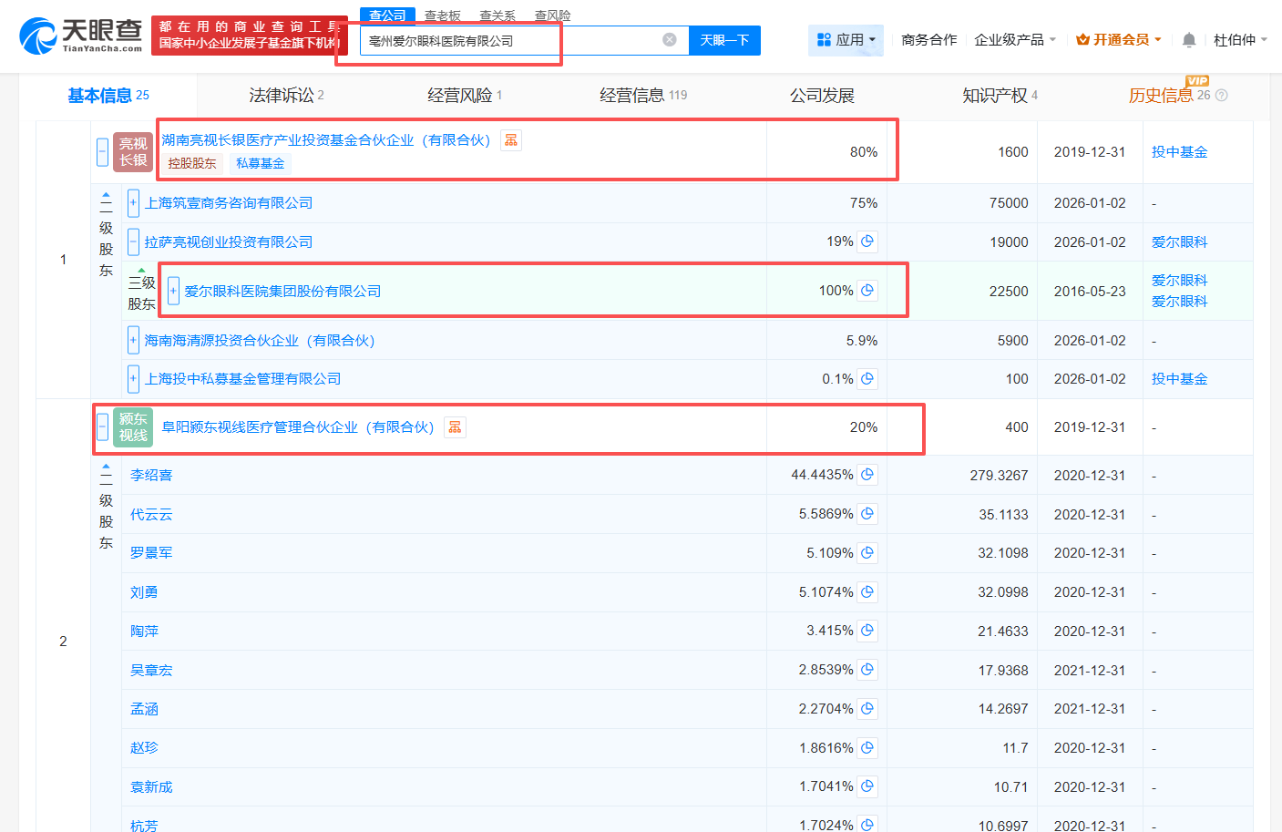 亮视长银基金的执行事务合伙人系上海投中私募基金管理有限公司,爱尔眼科通过全资持股的拉萨亮视创业投资有限公司持有亮视长银基金19%的股份。持股20%的颍东视线的股东包括数十位自然人。