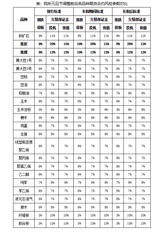 焦炭、焦煤品种期货合约涨跌停板幅度恢复至节前标准。其他品种期货合约涨跌停板幅度和交易保证金水平维持不变。