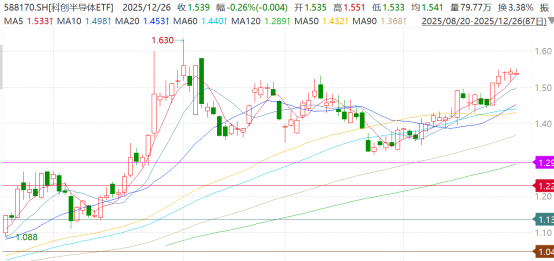 规模数据来源:Wind,上交所,截至2025年12月25日,科创半导体ETF规模为36.43亿元。全市场同类第一指全市场跟踪上证科创板半导体材料设备指数且上市交易的ETF产品中对应数据位列第一。芯片ETF规模为260.44亿元。全市场同指数规模第一指全市场跟踪国证半导体芯片指数且上市交易的ETF产品中对应数据位列第一。