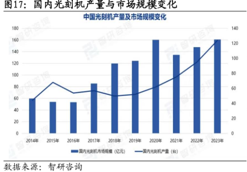 近年来,国产光刻机产量稳步提升。根据数据显示,2022年我国光刻机产量已经突破百台,规模也突破了140亿元。而后三年产量处于快速上升阶段。