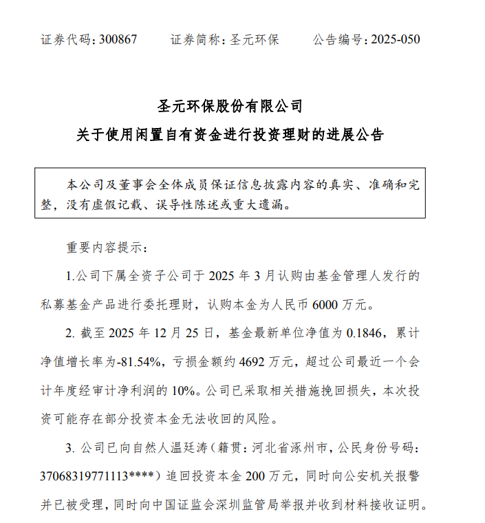 买私募产品9个月净值只剩0.1846 圣元环保亏到报警