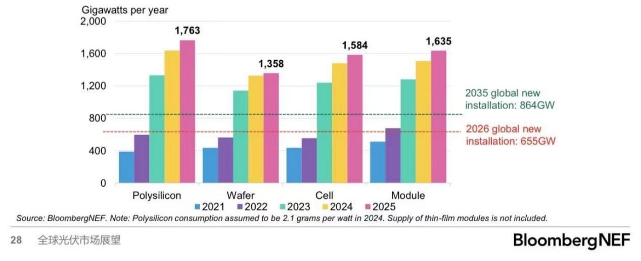 行业数据揭示了这一矛盾的根源。来自彭博新能源的图表显示,当前全球光伏产业链各环节产能已大幅超出2026年新装机需求的预测:其中组件产能过剩最为严重,超出169%,电池片产能也超出142%。