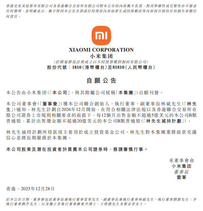 2025年12月28日晚间,小米集团-W(01810.HK)公告称,公司联合创始人、执行董事、副董事长林斌计划自2026年12月开始,每12个月出售金额不超过5亿美元的公司B类普通股,累计出售总金额不超过20亿美元。林斌表示对集团业务前景充满信心并将长期服务于集团。林斌减持计划所得款项主要用于成立投资基金公司。