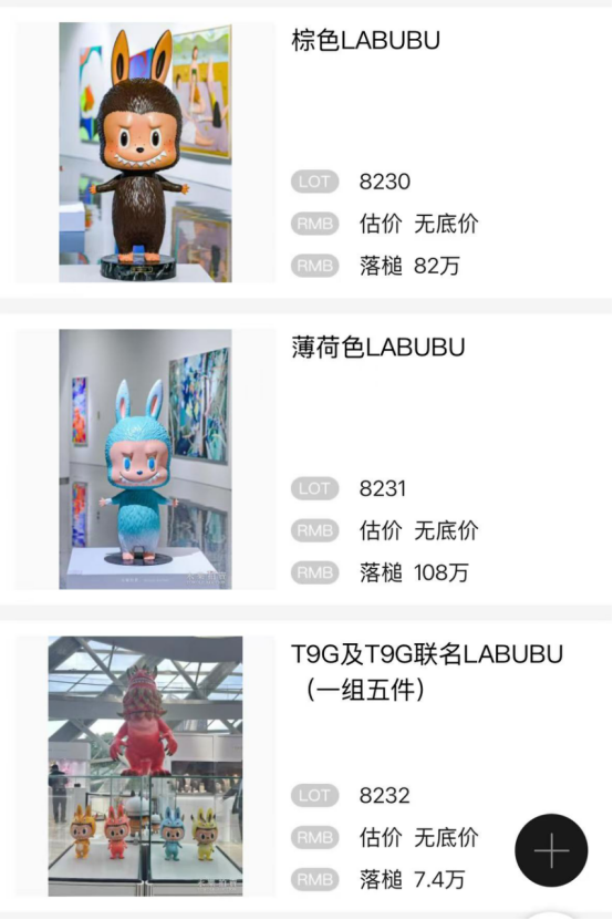 今年6月,明星上场带火的拉布布更是高开疯走,几乎全线溢价。6月10日,在永乐2025春季拍卖会上,一款初代藏品级薄荷色的LABUBU更是拍出108万元的“天价”。此外,一款全球限量15版棕色LABUBU以82万元成交。在永乐拍卖品台上,多款LABUBU落槌价达数万元。