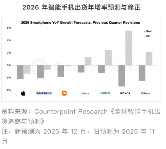 Counterpoint预计,2026年全球智能手机出货量可能出现2.1%的下滑。与此同时,DRAM价格上涨推升BoM(物料清单)成本,低、中、高价位段机型分别增加约25%、15% 与10%,且至2026年第二季仍可能再增10%-15%。在成本转嫁与产品组合调整下,智能手机平均售价预测上修至年增6.9%(9月预测为3.6%)。